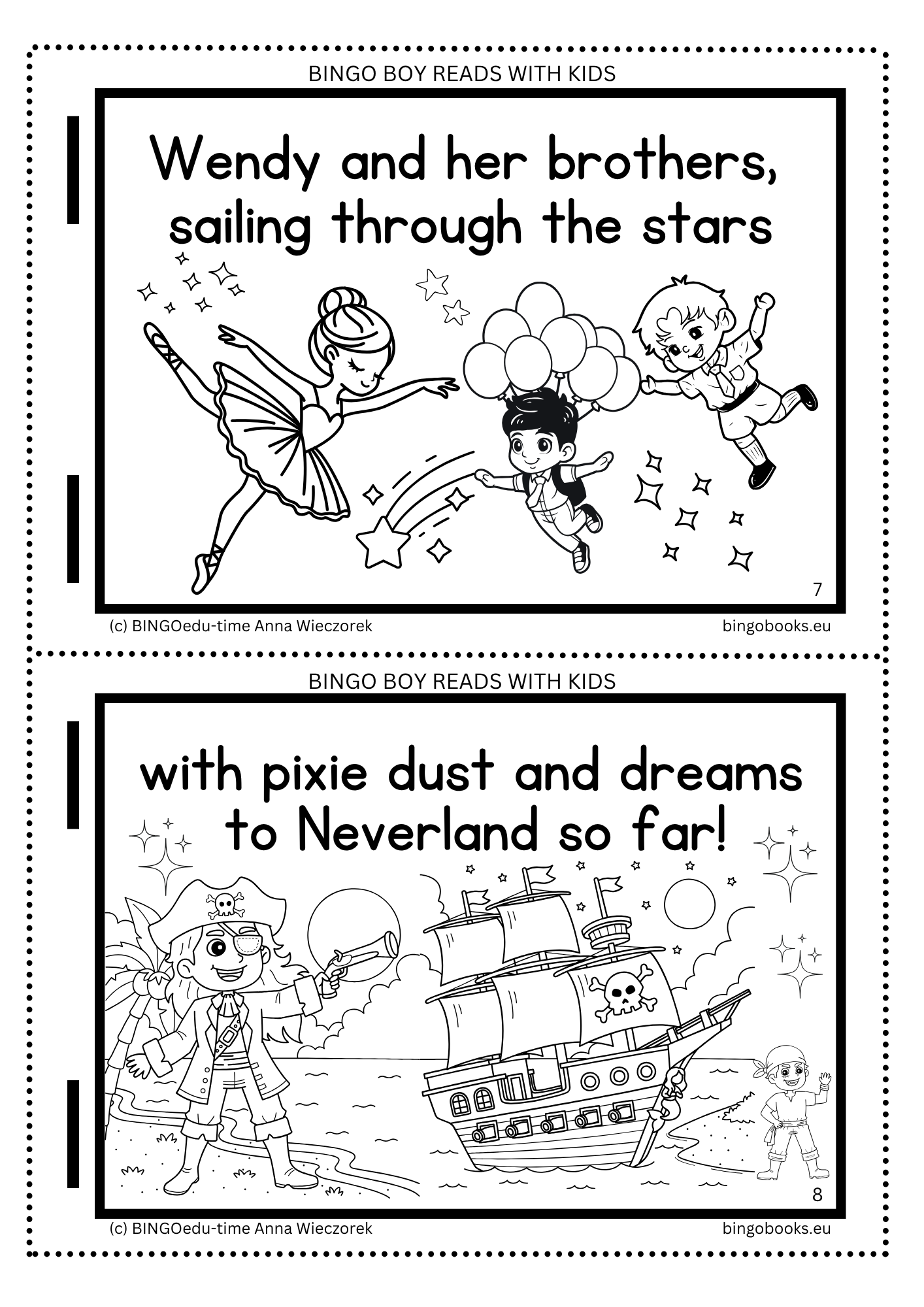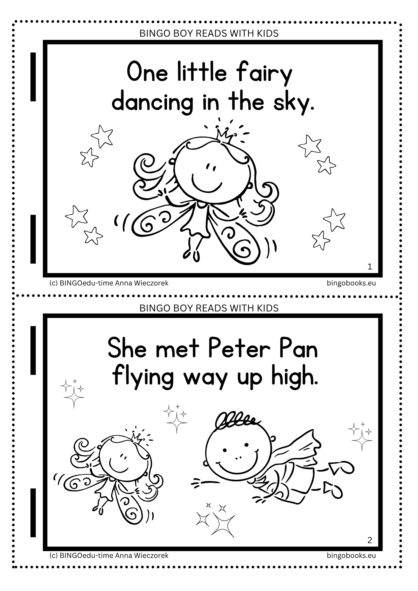 Szablon książeczki pt. PETER PAN to idealny materiał dla dzieci, które stawiają pierwsze kroki w NAUCE CZYTANIA PO ANGIELSKU METODĄ GLOBALNĄ. W treści książeczki dzieci spotkają bohaterów znanej bajki szkockiego autora J.M. Barriego pt. 'Piotruś Pan’. Rymowany tekst oraz choreografia dłoni, którą autorka przedstawia na filmie dołączonym do tej publikacji pomogą dzieciom opanować tekst najpierw w formie zabawy paluszkowej (Finger Play), a potem ułatwią samodzielne przeczytanie książeczki. Dzięki odpowiednio dużej, bezszeryfowej czcionce i prostej formule tekstu, dziecko z łatwością poradzi sobie z przeczytaniem tej lektury SAMODZILENIE!
